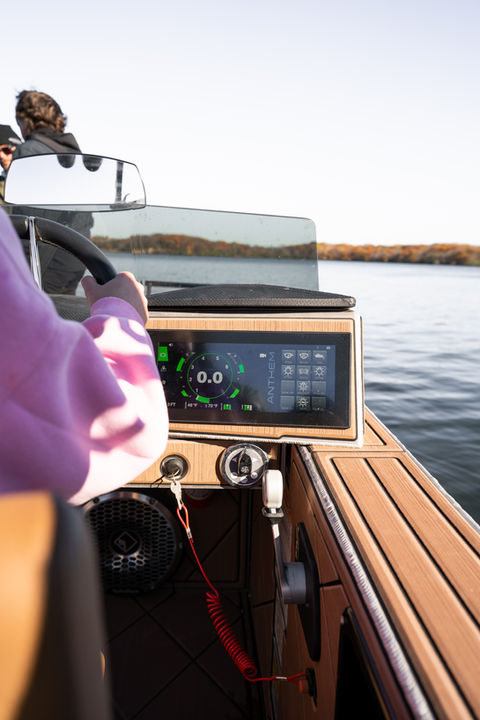 Purists feel at home, new boaters won’t be intimidated. Custom driver seat with swing up arm rests, vertical, fore/aft adjustment and bolster. Thruster. Digital shift and throttle. Dual glove boxes, tilt wheel and premium steering system. 12” touch screen with full engine management, navigation, surf/ballast controls, digital switches and Zero Off. RGB lighting and superb bluetooth stereo with over 1500 watts of power. Anthem gets it right.